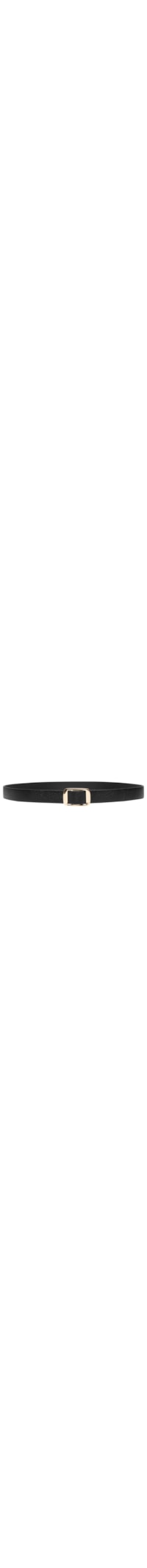 O cinto preto é produzido em material sintético. A peça possui espessura fina e fechamento frontal por fivela metalizada e em formato quadrado.