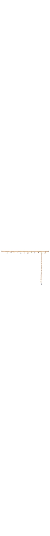 O cinto dourado é produzido em metal. A peça de espessura fina possui corrente metálica com elos entrelaçados, mix de aplicações de pedrarias em pingentes metálicos figurativos e fechamento posterior por fecho lagosta.