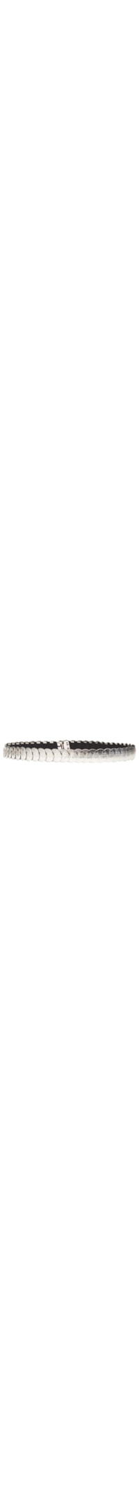 O cinto prateado é produzido em elástico. A peça possui espessura fina, medalhas metálicas texturizadas aplicadas e sobrepostas, e fechamento frontal por encaixe.