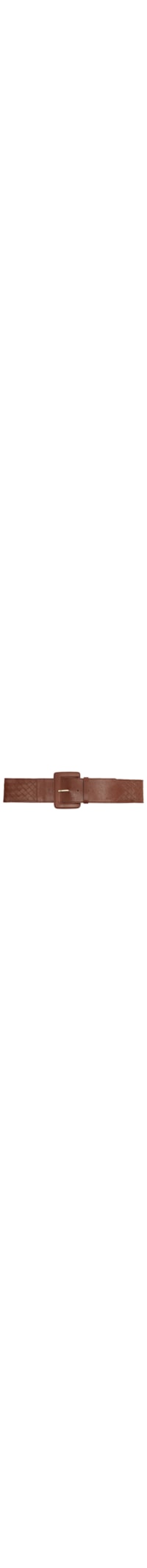O cinto marrom é produzido em couro. A peça possui espessura média, passante, recorte com padronagem trançada, ponteira triangular, cinco perfuros para ajuste e fechamento frontal em fivela retangular.