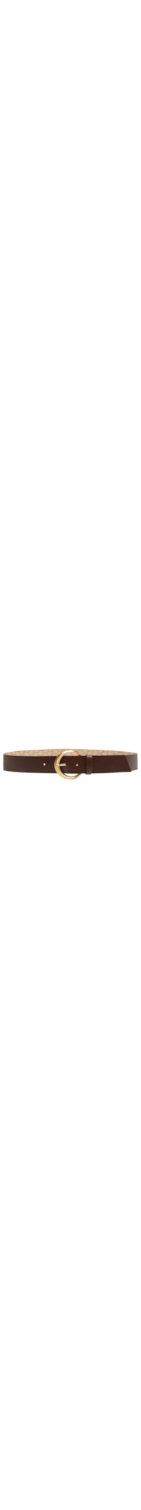 O cinto marrom é produzido em couro. A peça possui espessura média, passantes, perfuros e fechamento frontal por fivela metálica arredondada e regulável.