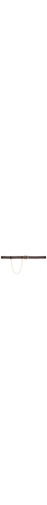 O cinto marrom é produzido em couro misto. A peça possui espessura fina, perfuros, passante e corrente por encaixe metálicos na cor dourado na parte frontal e fechamento frontal por fivela metálica.