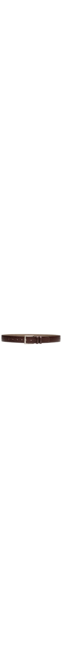 O cinto marrom é produzido em couro com superfície texturizada. A peça possui espessura média, passante fixo e fechamento frontal por fivela metálica em formato quadrado.