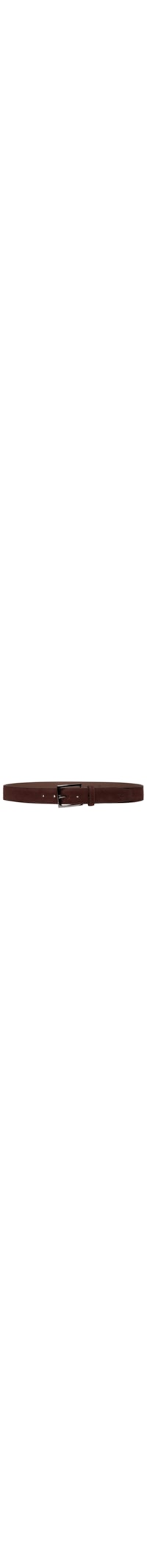 O cinto marromé produzido em camurça. A peça possui espessura média, passante fixo, 5 perfuros, aplicação discreta de logo em baixo-relevo na extremidade e fechamento por fivela retangular regulável com acabamento polido.
