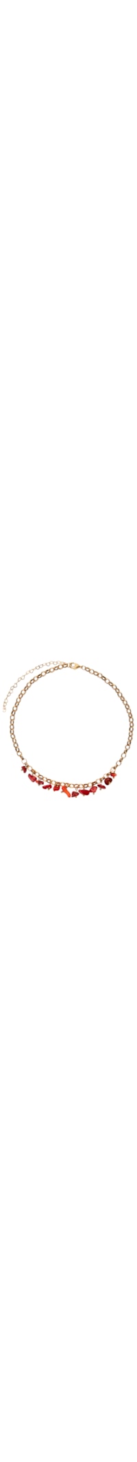 O colar vermelho é produzido em metal com banho de ouro. A peça de comprimento curto, possui elos entrelaçados, pingentes de pedras corais aplicadas em tamanhos irregulares, extensor com elos em formato figurativo de corações e fechamento posterior por fecho lagosta.