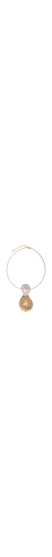 O colar dourado é produzidoem metal. A peça possui aro fino, dois pingentes com formato de conchas, acabamento texturizado e efeito martelado, um em prata e outro maior em dourado, corrente extensor para ajuste de comprimento e fechamento posterior por gancho.