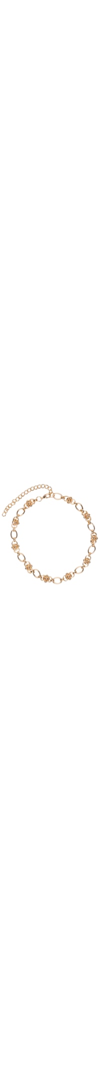 O colar dourado é produzido em metal. A peça possui espessura média, elos de tamanhos diferentes, detalhes em elos sobrepostos, corrente extensora e fechamento posterior por fecho lagosta.