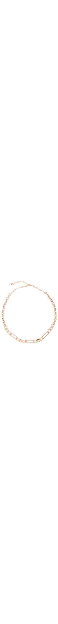 O colar dourado é produzido em metal. A peça possui comprimento e espessura média, mix de elos com tamanhos variados e formatos alongados, corrente extensora, acabamento polido e fechamento posterior por fecho lagosta.