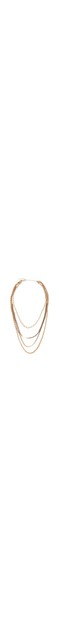 O colar dourado é produzido em metal. A peça possui espessura média, 4 correntes com diferentes elos, tamanhos e espessuras e fechamento posterior por fecho lagosta.