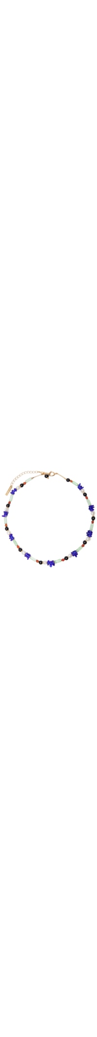 O colar azul é produzido em miçangas de vidro. A peça possui espessura fina, miçangas com formatos distintos e cores contrastantes, extensor em corrente de elos entrelaçados removível por fecho lagosta, ponteira com tag da marca aplicada e fechamento por fecho boia.
