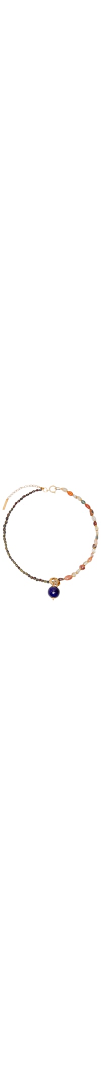 O colar bege é produzido em pedras naturais. A peça possui espessura média, pedras de tamanhos distintos e cores contrastantes com base metalizada, pingente em pedra de porcelana azul removível, extensor em corrente de elos entrelaçados removível por fecho lagosta, ponteira com tag da marca aplicada e fechamento por fecho boia.