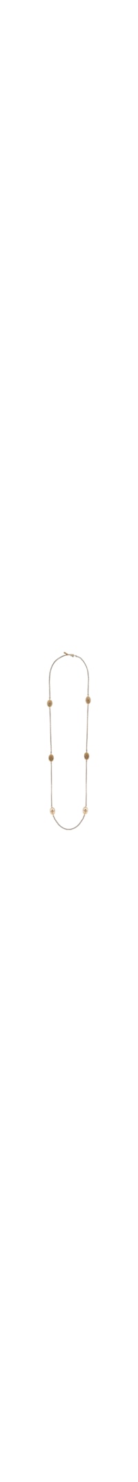 O colar dourado é produzido em metal. A peça possui comprimento longo, espessura fina, corrente em elos entrelaçados, medalhas ovais com lateral em relevo e pedrarias aplicadas na superfície, tag metalizada da marca aplicada no fecho, acabamento polido e fechamento posterior por encaixe.
