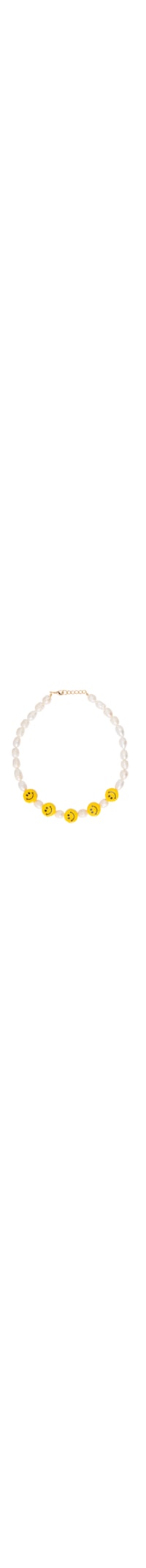 O colar branco é produzido em resina. A peça possui aplicação de miçangas em tons contrastantes, pérolas de água doce e fechamento por gancho metálico com regulagem.