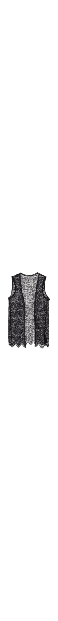 Colete de algodão caracterizado por um belo trabalho de crochê com desenho geométrico. A borda ondulada torna a peça especialmente bonita.