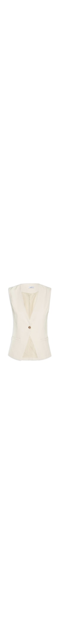 O colete bege é confeccionado em tecido leve com baixa elasticidade. A peça solta ao corpo possui decote v profundo, alças largas, dois bolsos decorativos na parte frontal, recortes frontais e posteriores, forro, fenda frontal e fechamento frontal por botão metálico.