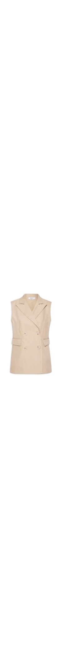O colete bege é confeccionado em tecido leve com baixa elasticidade. A peça solta ao corpo possui lapela chanfrada, alças largas, cavas regulares, bolsos frontais com abas sobrepostas, recortes frontais e posteriores, comprimento alongado e fechamento frontal por botões.
