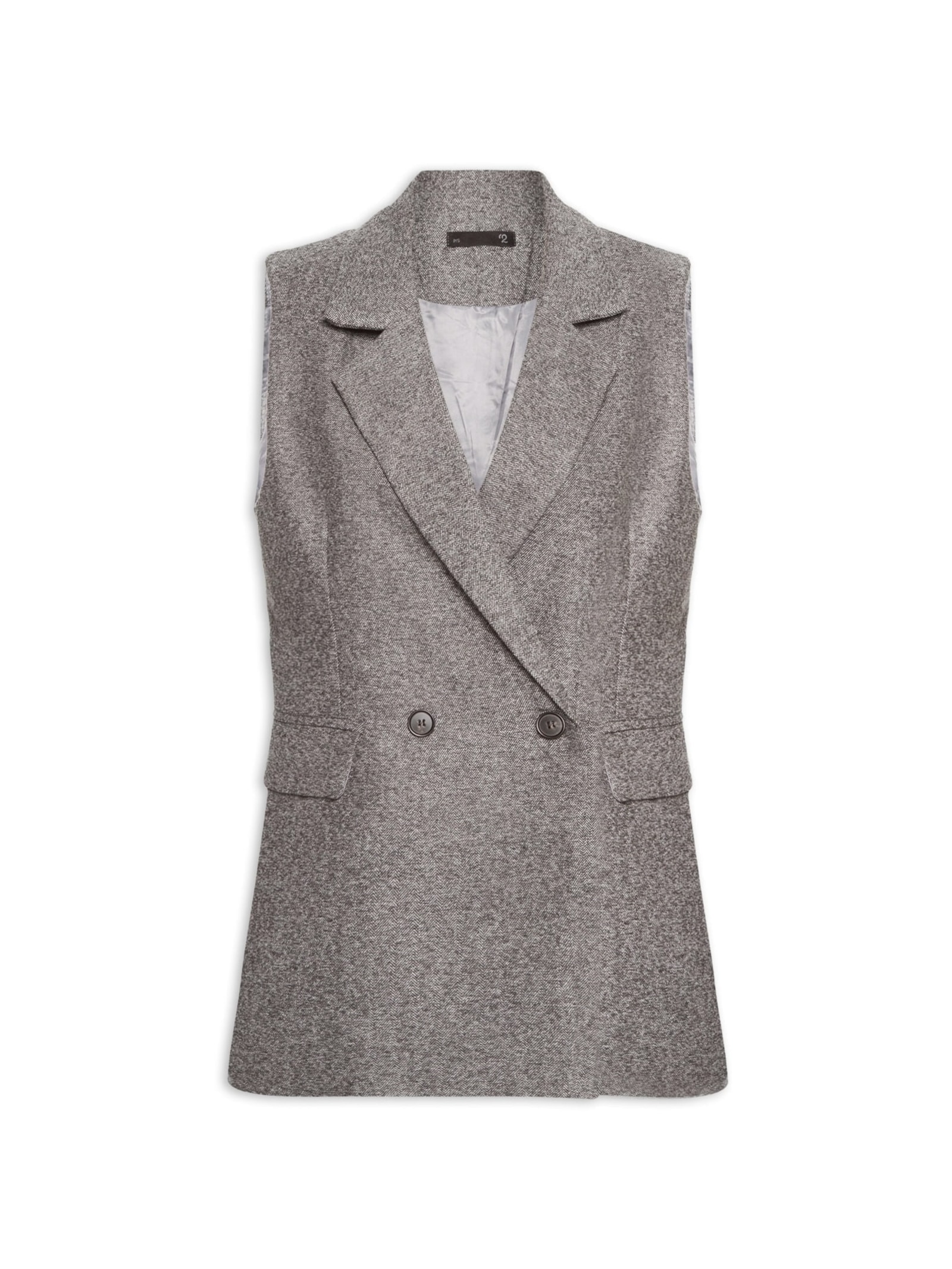 O colete cinza é confeccionado por tecido encorpado sem elasticidade. A peça solta ao corpo possui lapela chanfrada, cavas alongadas, recorte frontais, bolsos frontais decorativos com abas sobrepostas, forro, comprimento alongado e fechamento frontal por botões.