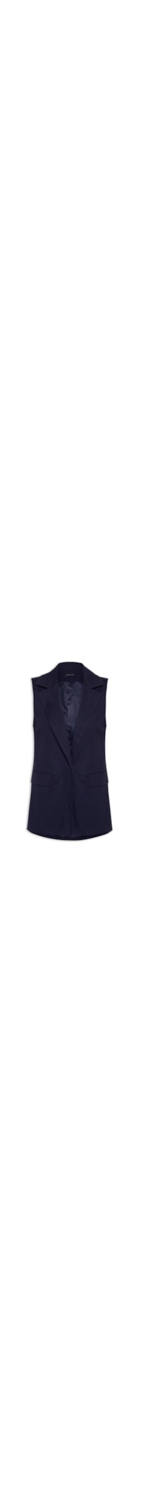 O colete azul marinho é confeccionado em tecido leve com toque de linho sem elasticidade. A peça solta ao corpo possui decote V profundo, lapela chanfrada, cavas regulares, ombros com ombreiras embutidas e martingales aplicados, forro, bolsos frontais decorativos com vistas sobrepostas, comprimento longo e fechamento frontal por botão.