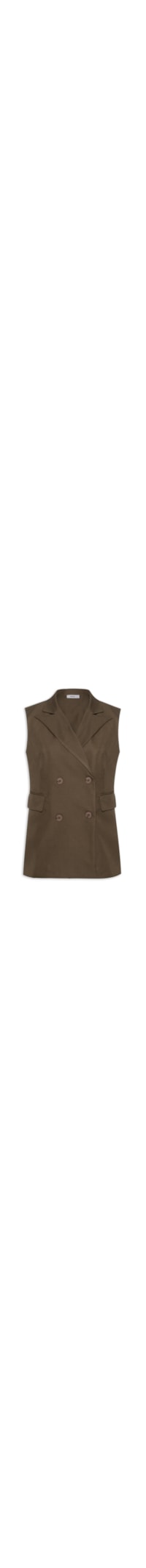 O colete marrom é confeccionado em tecido leve com baixa elasticidade. A peça solta ao corpo possui lapela chanfrada, alças largas, cavas regulares, bolsos frontais com abas sobrepostas, recortes frontais e posteriores, comprimento alongado e fechamento frontal por botões.