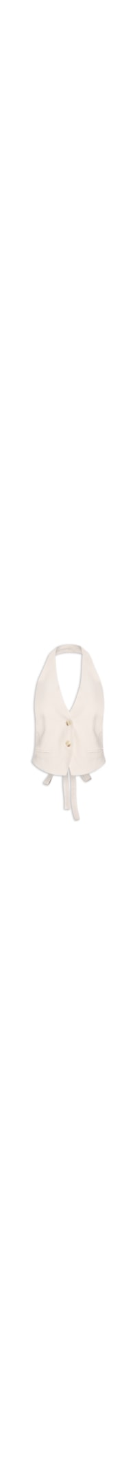 O colete bege é confeccionado em tecido leve sem elasticidade. A peça solta ao corpo possui frente única com lapela chanfrada, alças médias, bolsos frontais decorativos, tag da marca em metal aplicada na parte frontal, recortes frontais, forro, comprimento *cropped, e fechamento posterior por amarração.