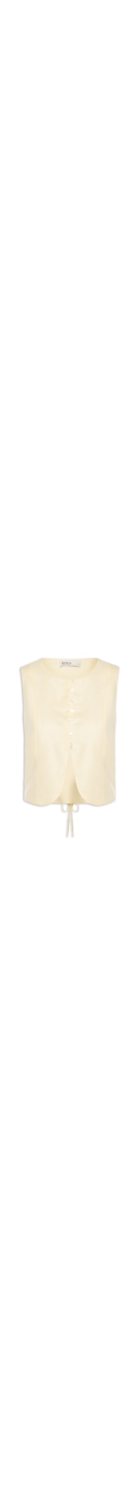 O colete bege é confeccionada em tecido leve com toque de linho sem elasticidade. A peça solta ao corpo, possui decote redondo, alças largas, fenda frontal, recortes frontais, recortes posteriores com passantes aplicados e cordão para amarração e ajuste posterior, borro e fechamento frontal por botões.