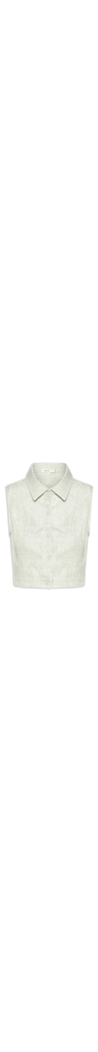 O colete verde é confeccionado em tecido leve sem elasticidade. A peça solta ao corpo possui colarinho clássico, alças largas, cavas regulares, bolsos frontais, pences frontais e posteriores, comprimento cropped* e fechamento frontal por botões.