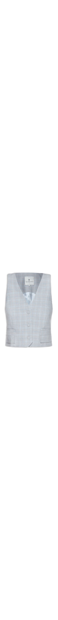 O colete cinza é confeccionado em tecido leve sem elasticidade. A peça solta ao corpo possui decote V profundo, alças largas, padronagem xadrez em cor contrastante azul, bolsos decorativos com aba sobreposta, passante com fivela na parte posterior com regulagem, fenda na parte posterior, forro e fechamento frontal por botões.