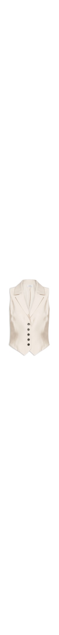 O colete bege éconfeccionado em malha leve sem elasticidade. A peça solta ao corpo possui lapela chanfrada, alças largas, cavas alongadas, forro, recortes frontais e posteriores, detalhe de recorte em V na barra e fechamento frontal por botões.