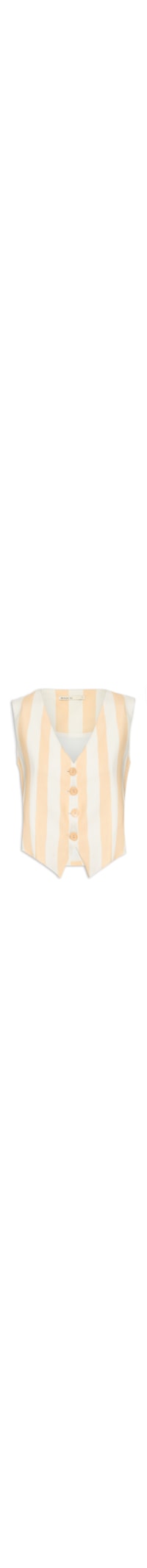 O colete bege é confeccionado em tecido leve com toque de linho e sem elasticidade. A peça solta ao corpo possui decote V, alças largas, cavas estendidas, pences frontais, tiras alongadas aplicadas na parte posterior com ajuste por fivela metálica, padronagem listrada em cor contrastante, barra frontal assimétrica, forro e fechamento frontal em botões.
