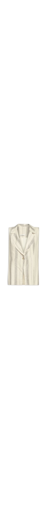 O colete bege é confeccionado em tecido leve com toque de linho e sem elasticidade. A peça solta ao corpo possui lapela chanfrada, cavas estendidas, padronagem de listras na cor cinza, fenda posterior, forro, estampa listrada, comprimento alongado e fechamento frontal por botões.