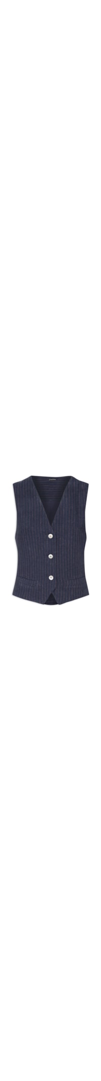 O colete azul é confeccionado por tecido leve com toque em linho sem elasticidade. A peça solta ao corpo possui decote V, alças médias, cavas estendidas, bolsos frontais decorativos, faixa com colchete posterior aplicado, recorte posterior com bordado em coração na cor laranja, estampas listradas, forro e fechamento frontal por botão.