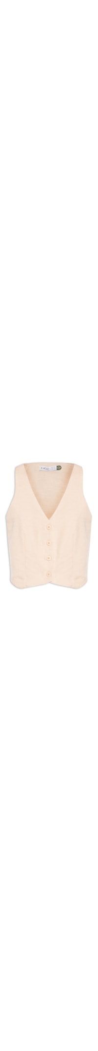 O colete bege é confeccionado em tecido leve com toque de linho sem elasticidade. A peça ajustada ao corpo possui decote em V, alças médias, cavas regulares, recortes frontais, costas com transpasse e abertura, comprimento regular, barra com acabamento assimétrico e fechamento frontal por botões.