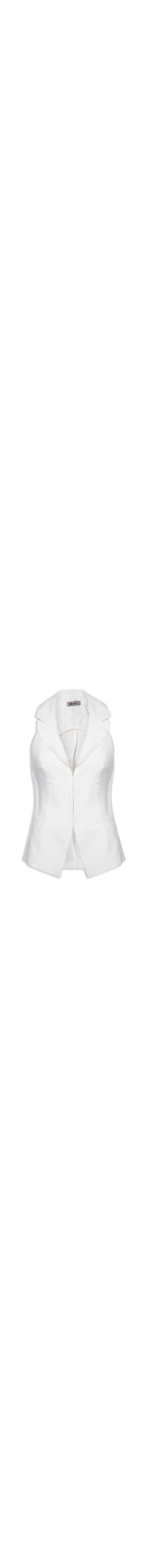 O colete off white é confeccionado em tecido leve sem elasticidade. A peça solta ao corpo possui lapela chanfrada, alças largas, recortes posteriores e frontais, forro, tag da marca aplicada em metal na parte frontal na altura da barra, bolsos frontais decorativos e fechamento frontal por colchetes.