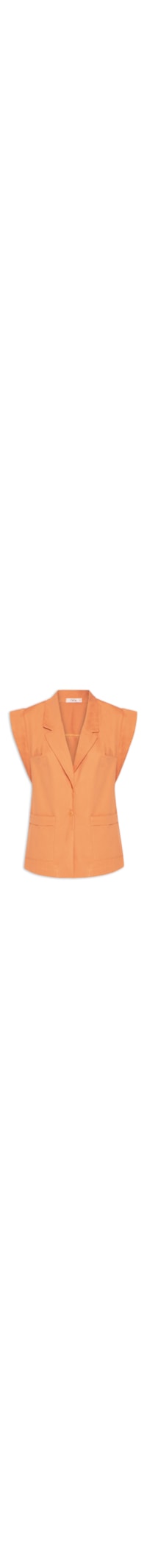 O colete amarelo é confeccionado em tecido leve sem elasticidade. A peça solta ao corpo possui lapela chanfrada maxi, recorte posterior com prega, ombros estendidos, cavas com dobra e estendidas, pences e bolsos frontais e fechamento frontal por botões.