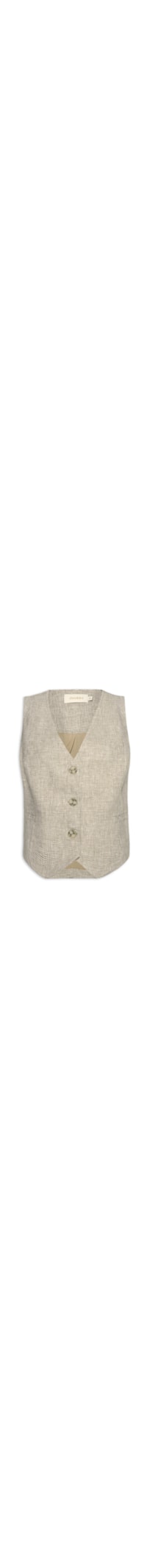 O colete bege é confeccionado em linho sem elasticidade. A peça solta ao corpo, possui decote em V, alças largas, recortes frontais, bolsos frontais embutidos, recorte posterior, barra assimétrica na parte frontal, padronagem pied poule em cor contrastante, forro e fechamento frontal por botões.