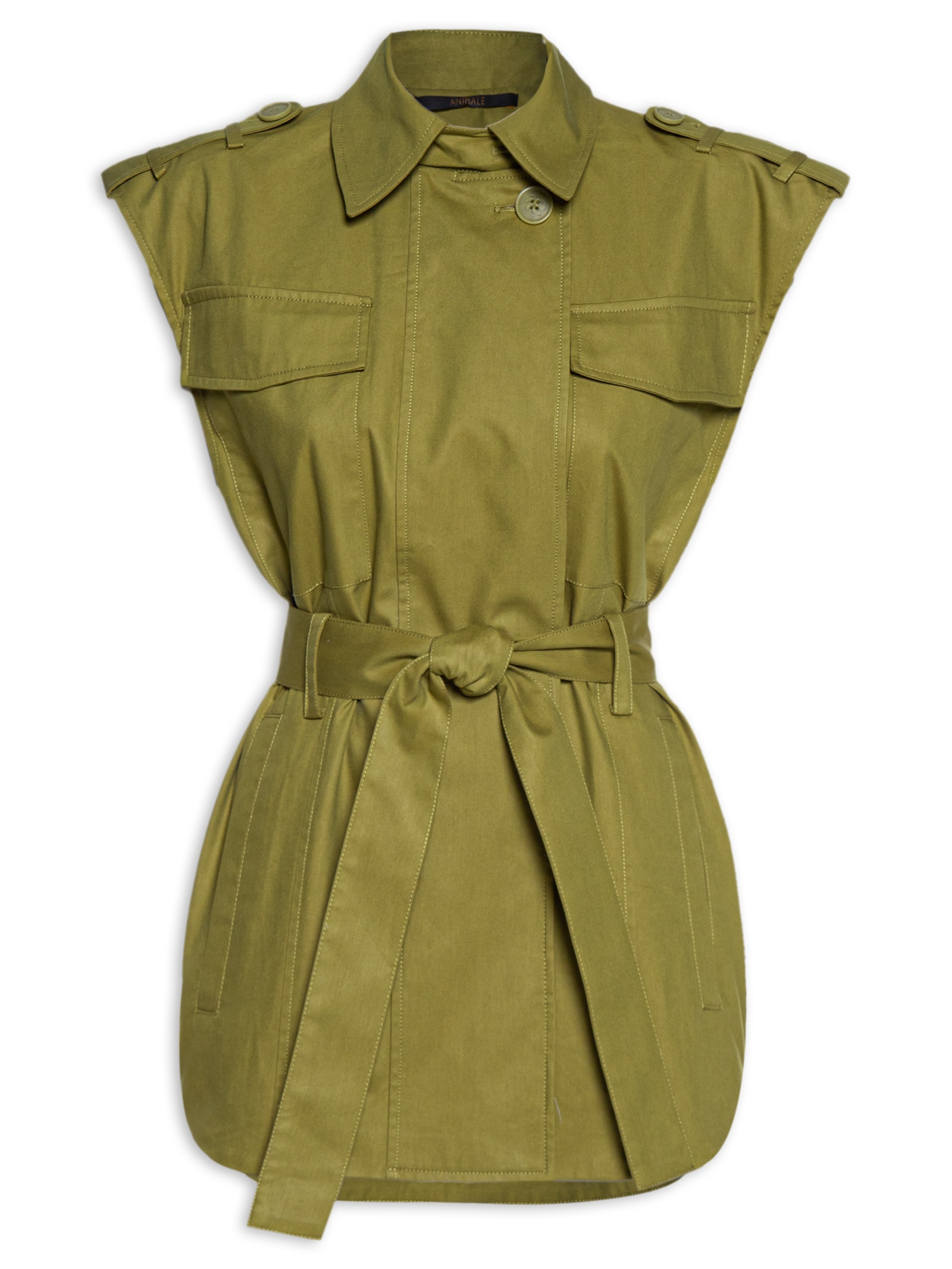 O colete verde é confeccionado em tecido leve sem elasticidade. A peça solta ao corpo possui colarinho clássico, alças largas, detalhe martingale aplicado nos ombros, dois bolsos frontais com aba sobreposta na área do busto, passantes aplicados na área da cintura, dois bolsos frontais na área do quadril, barra arredondada, recortes frontais, forro, e fechamento frontal por botões. Acompanha cinto em mesmo tecido para uso opcional.