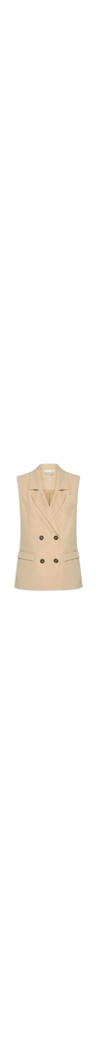 O colete bege é confeccionado por tecido leve sem elasticidade. A peça solta ao corpo possui lapela chanfrada, cavas estendidas, bolsos frontais decorativos com aba sobreposta, recorte posterior com fenda aplicada, forro e fechamento por botões frontais.
