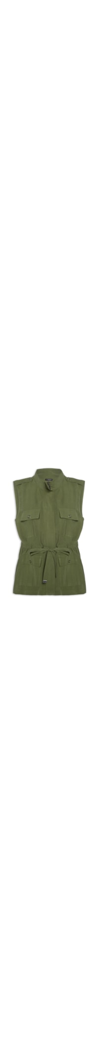 O colete verde é confeccionada em tecido leve sem elasticidade. A peça solta ao corpo possui gola alta, alças largas, detalhes em martingale nos ombros, dois bolsos frontais na área do busto e dois na área da cintura com aba sobreposta e fechamento por botão, cordão embutido na cintura para ajuste e fechamento frontal por zíper.