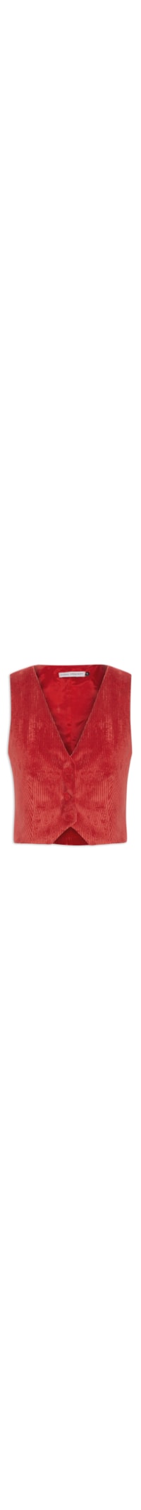 O colete vermelho é confeccionado em veludo cotelê sem elasticidade. A peça solta ao corpo, possui decote em V, alças largas, recorte frontal, barra assimétrica na parte frontal, comprimento cropped*, forro e fechamento frontal por botões forrados: