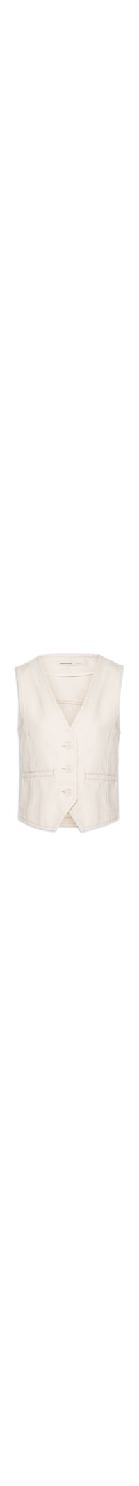O colete bege é confeccionado em sarja sem elasticidade. A peça solta ao corpo possui decote V, alças largas, cavas estendidas, recortes posteriores e frontais, bolsos frontais decorativos e fechamento frontal por botões.