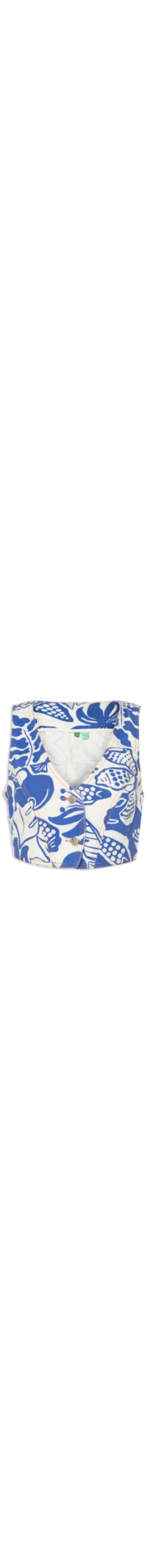 O colete azul é confeccionado em sarja. A peça possui decote V, cavas regulares, recortes frontais e posteriores, mix de estampas em cores contrastantes, comprimento cropped*, shape solto e fechamento frontal por botões.