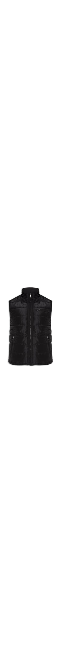O colete preto é confeccionado em tactel. A peça solta ao corpo de modelo puffer* possui gola alta, cavas regulares, bolsos frontais embutidos com fechamento por zíper e fechamento frontal por zíper.