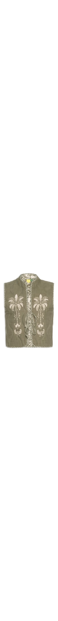 O colete verde é confeccionado em tecido encorpado sem elasticidade. A peça possui gola alta, cavas regulares, estampas figurativas de coqueiro na parte frontal e posterior de cor contrastante, estampa corrida na parte interna da peça, não possui mangas, possui tiras embutidas para amarração frontal e acabamento pespontado.