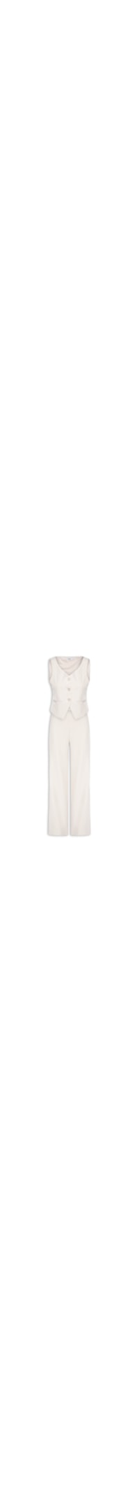 O conjunto bege é confeccionado em tecido encorpado sem elasticidade. O colete justo ao corpo possui decote V, cavas regulares, recortes frontais e posteriores, bolsos frontais embutidos, forro e fechamento frontal por botões. A calça solta ao corpo possui cintura alta, bolsos frontais embutidos, pences posteriores, comprimento longo e fechamento lateral por zíper invisível.