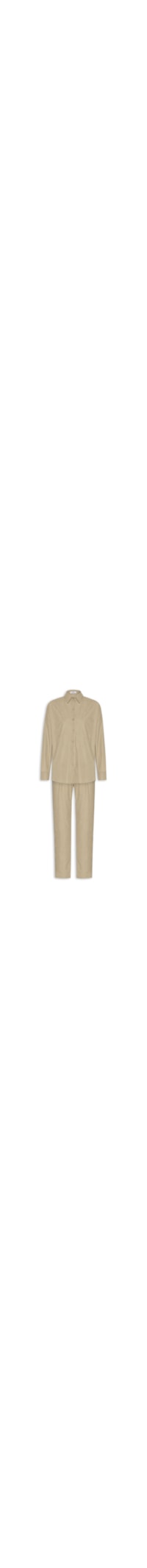 O conjunto bege é confeccionado em tecido leve com superfície texturizada sem elasticidade. A camisa solta ao corpo, possui colarinho simples, ombros estendidos, mangas longas com abotoamento nos punhos, barra mullet* arredondada e fechamento frontal por botões. A calça solta ao corpo, possui cintura alta, cós com elástico embutido na parte posterior, bolsos frontais de modelo faca, comprimento cropped** e fechamento frontal por zíper e botões.