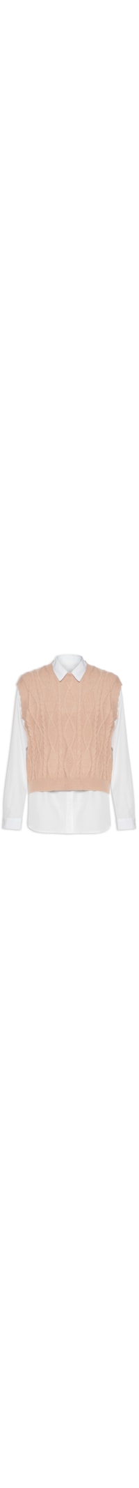 O conjunto bege contém uma camisa e um colete confeccionado em tecido leve sem elasticidade e tricot com alta elasticidade. A camisa branca é solta ao corpo possui colarinho simples, mangas longas com ajuste nos punhos por botões, barra com acabamento arredondado e fechamento por botões frontais. O colete bege é solto ao corpo possui gola redonda com acabamento alongado, alças grossa, cavas levemente estendidas e mix de tramas.