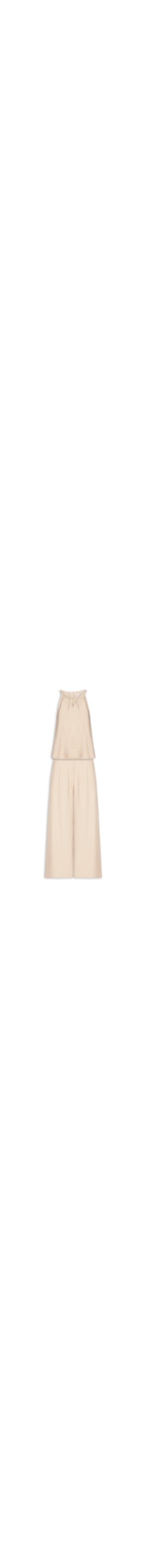 O conjunto bege é confeccionado em tecido leve e sem elasticidade. A blusa solta ao corpo possui decote redondo com efeito trançado, alças finas, cavas estendidas, recorte posterior vazado e fechamento posterior por botão. A calça solta ao corpo possui cintura alta, cós reto, bolsos frontais de modelo faca, pences posteriores e pregas frontais, comprimento longo e fechamento posterior por zíper invisível.