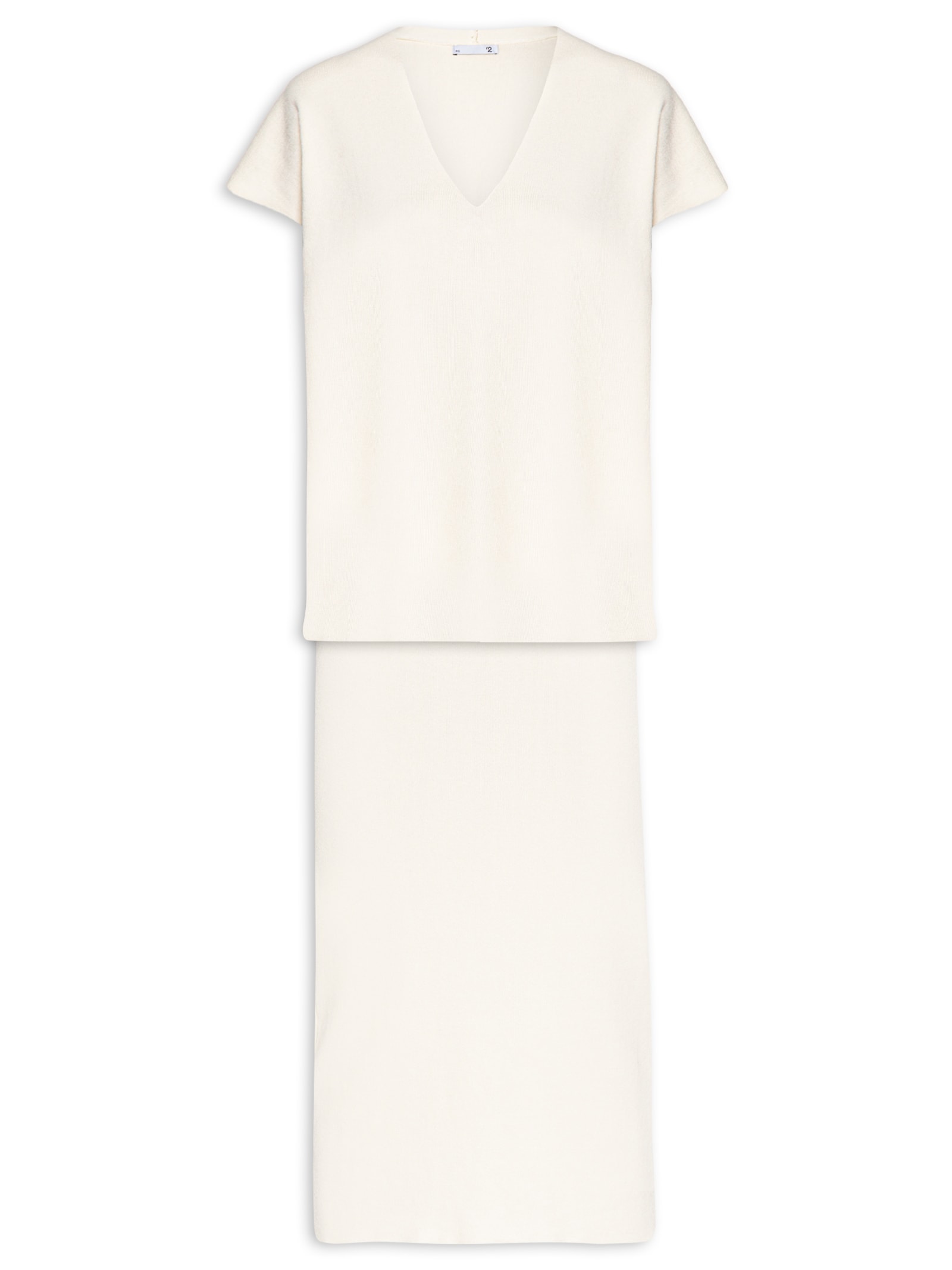 O conjunto off white é confeccionado em tricot com baixa elasticidade. A blusa solta ao corpo possui decote V, mangas curtas e recorte com fenda nas partes laterais. A saia solta ao corpo possui cintura alta, cós com elástico embutido e comprimento midi.
