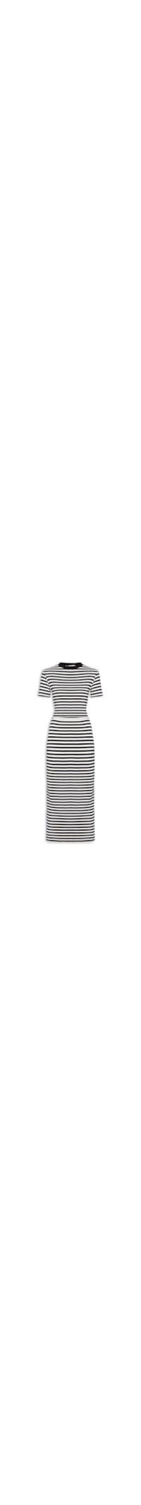 O conjunto preto é confeccionado em malha com alta elasticidade. A blusa solta ao corpo possui decote redondo com acabamento canelado e ondulado, mangas curtas, padronagem listrada na cor off white e comprimento cropped*. A saia justa ao corpo possui cintura alta, cós com elástico embutido, padronagem listrada na cor off white e comprimento midi.