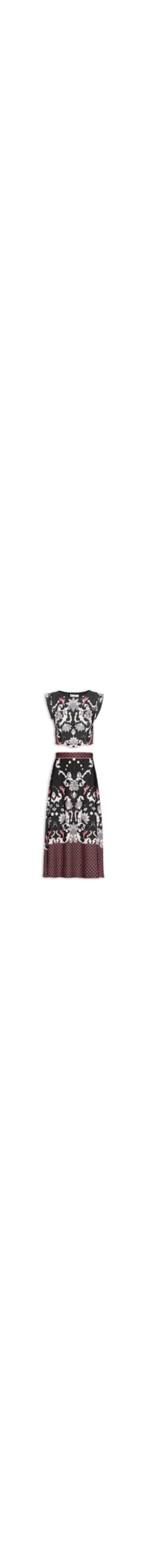 O conjunto preto é confeccionado em malha encorpada de média elasticidade. A blusa solta ao corpo possui decote redondo, ombros e cavas estendidas, pences frontais, recortes laterais com viés em tons contrastantes, mix de estampas abstratas e figurativas em tons contrastantes, barra assimétrica, forro, sem bojo, comprimento cropped* e fechamento posterior em zíper invisível. A saia solta ao corpo possui cintura alta, cós com detalhe de viés em tom contrastante, mix de estampas abstratas e figurativas em tons contrastantes, comprimento midi e fechamento posterior em zíper invisível.